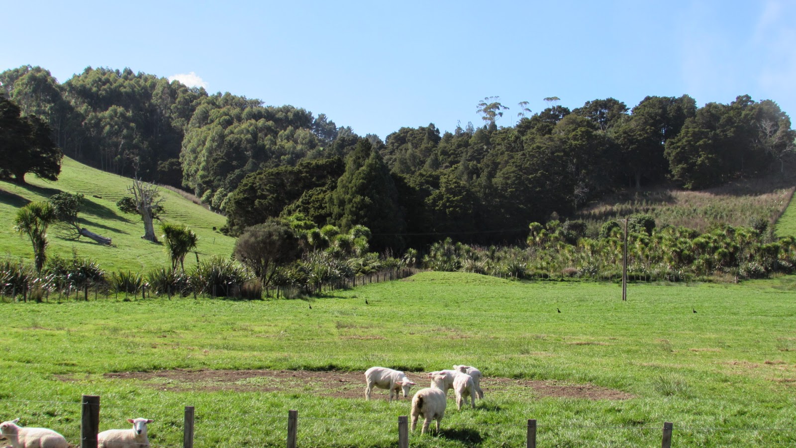 A glimpse of Littel Barrier just by the trees in the middle; rather a grey day...normally much more sunshine of course! Strategically sited resting places at the highest point on the seven kilometre pathway encourage users to take a break and admire the views; looking North across Omaha Flats, the orchards, market gardens and beach settlement of Omaha, Little Barrier Island is visible on the horizon. On the other side of Takatu Rd, looking back towards Matakana, the view is over farmland and a gully with undevelopedwetland.